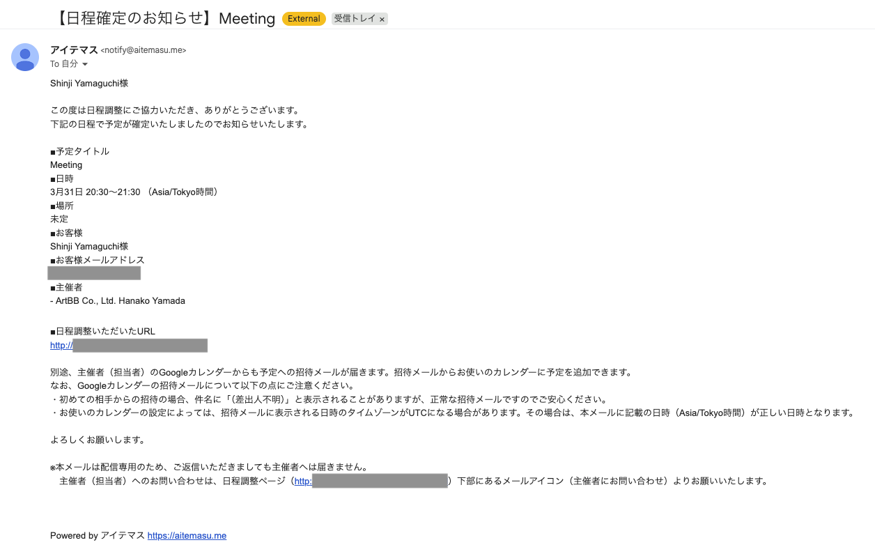 通常、日程調整が確定すると、主催者(担当者)のGoogleカレンダーから、確定した予定への招待メールが日程調整相手に送信されます。